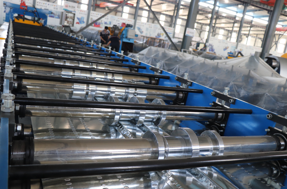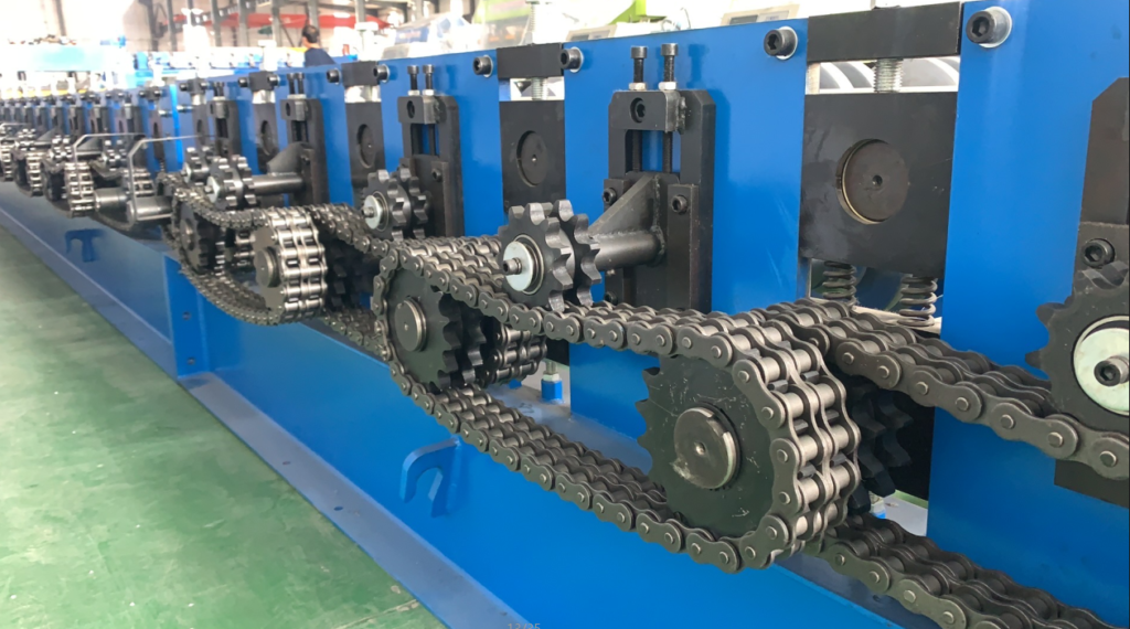 Add a pair of gears to the first row of rollers (embossing rollers) to make the upper and lower rollers rotate at the same time, making it easier for the steel coil to enter the forming machine.